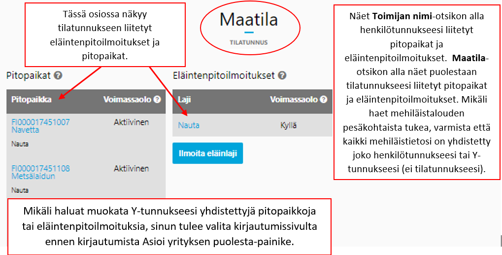 - Mikäli haet mehiläistalouden pesäkohtaista tukea, huomioi, että pitopaikat tulee rekisteröidä Y-tunnuksellasi tai henkilötunnuksellasi.