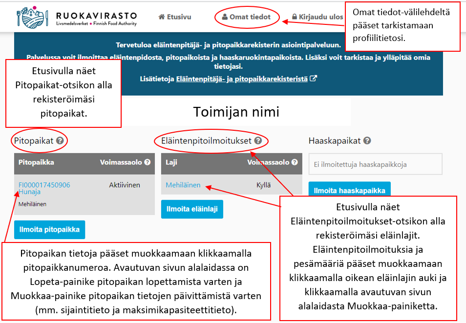 Tarkista ja korjaa Eläintenpitäjä- ja pitopaikkarekisteristä seuraavat ilmoittamasi tiedot: