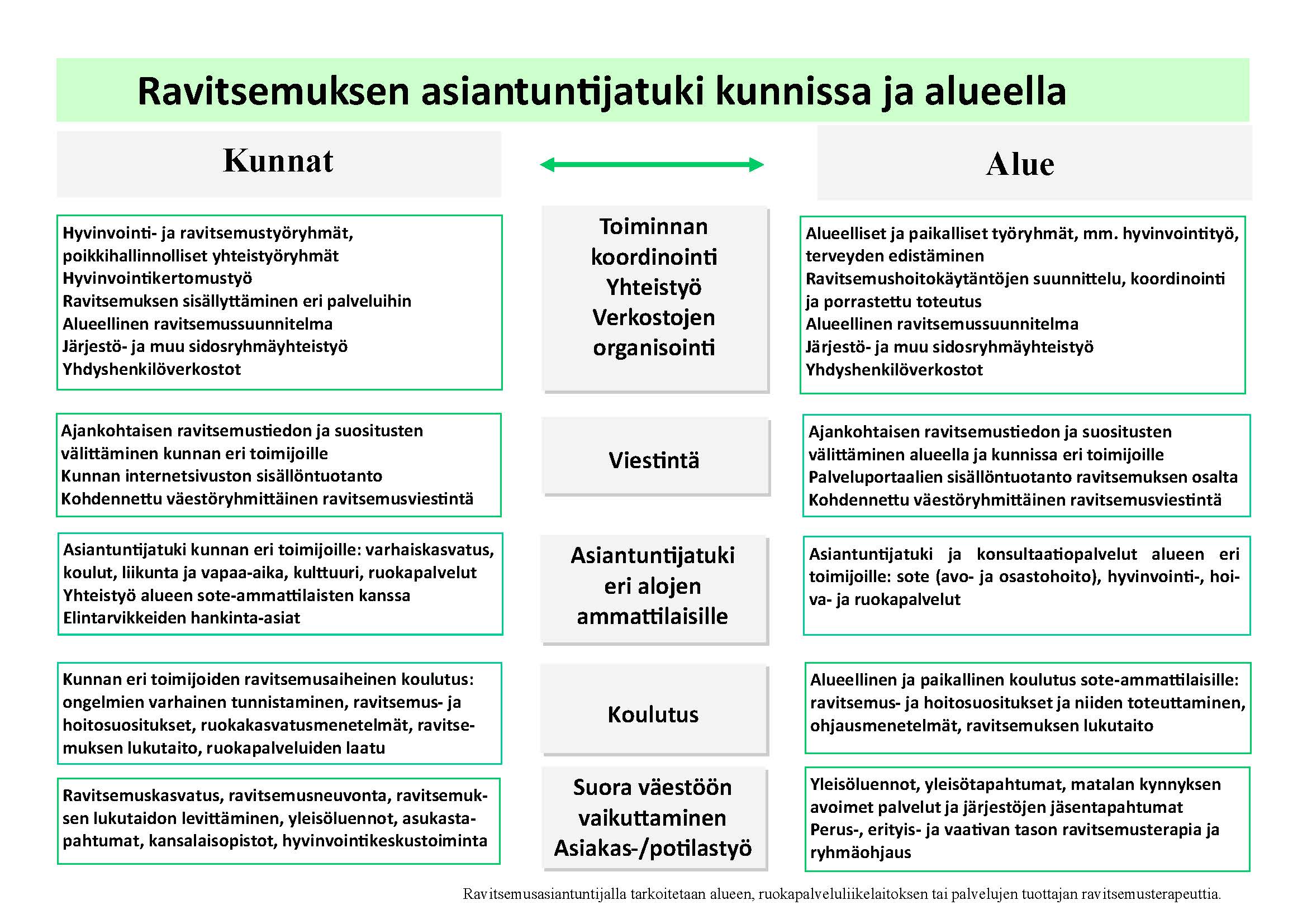 Alueen ja kunnan asukkaiden hyvän ravitsemuksen edistämiseen liittyvät linjaukset, toimenpiteet ja vastuualueet on tärkeä määrittää ja päättää yhdessä. Alueille tulee luoda yhteistyörakenteet, jotta ravitsemusasiat tulevat huomioiduksi osana alueellista palvelujärjestelmää. Ravitsemus on keskeinen asukkaiden terveyteen ja hyvinvointiin vaikuttamisen keino niin sosiaali- ja terveyspalveluissa kuin poikkihallinnollisessa terveyden ja hyvinvoinnin edistämistyössä. Ravitsemukseen liittyvät ratkaisut luodaan yhteistyössä alueen, kunnan eri hallinnonalojen, järjestöjen ja muiden paikallisten ja alueellisten toimijoiden, työpaikkojen ja elinkeinoelämän kanssa. On tärkeää, että asukkaiden ravitsemukseen liittyvät strategiset linjaukset ulottuvat myös konkreettisina toimina asukkaiden arkeen asti mahdollistaen hyvän ravitsemuksen tasavertaisen toteutumisen.