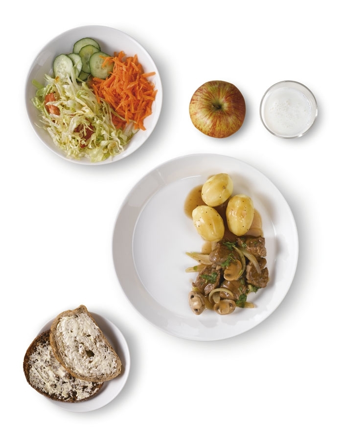 Muista lautasmalli, vaikka salaatille olisikin oma lautanen. Käytä perunalle ja lihalle/kalalle vain neljännekset lautasesta. Täydennä ateriaa sopivalla ruokajuomalla. Hedelmän voit nauttia välipalana.