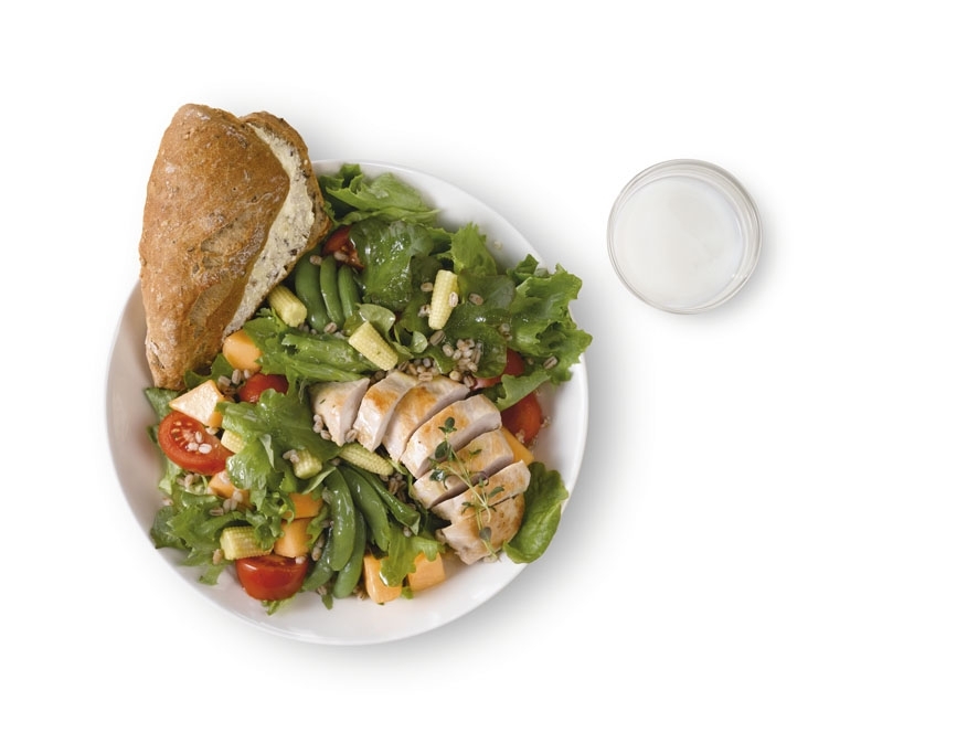 Salaattiateria täydentyy ravitsevaksi kokonaisuudeksi, kun salaattiin lorautetaan tilkka öljyä ja salaatin lisänä nautitaan täysjyväsämpylä ja lasillinen rasvatonta maitoa tai piimää tai täydennettyä kasvijuomaa.