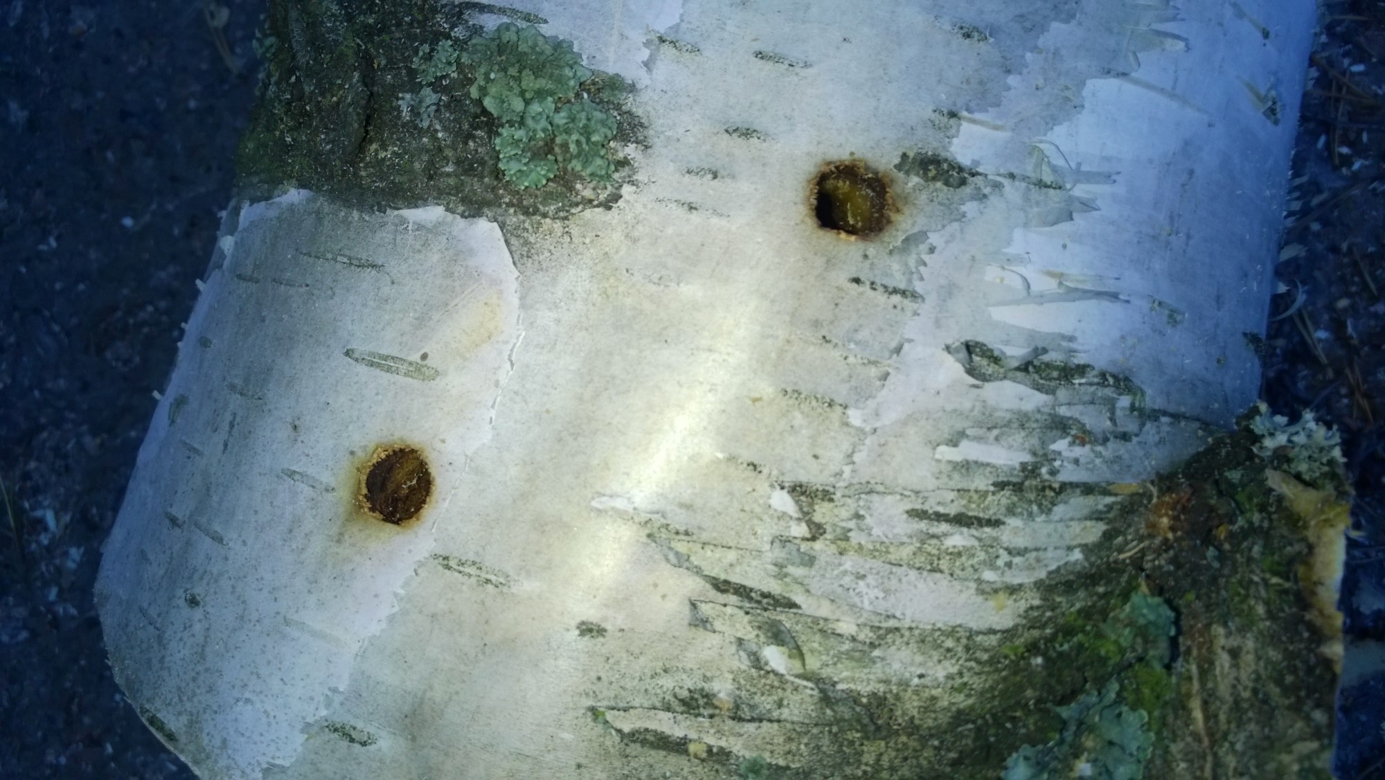 Aasianrunkojäärän tekemiä reikiä Suomessa kasvavassa koivussa. Kuva Ulla Oksanen