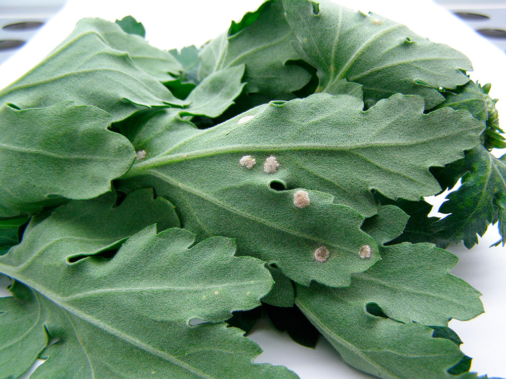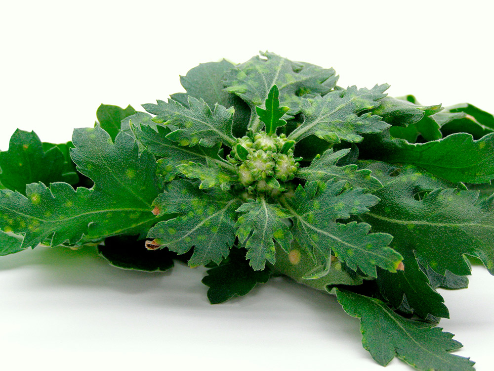 Krysanteemin valkoruosteen oireita.