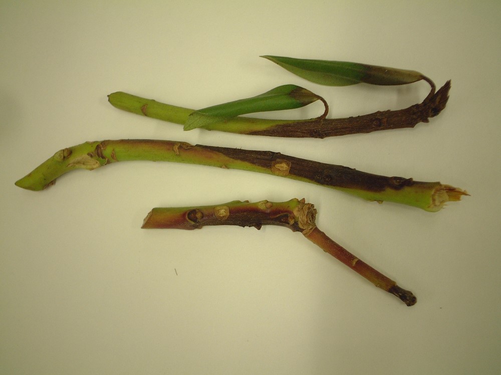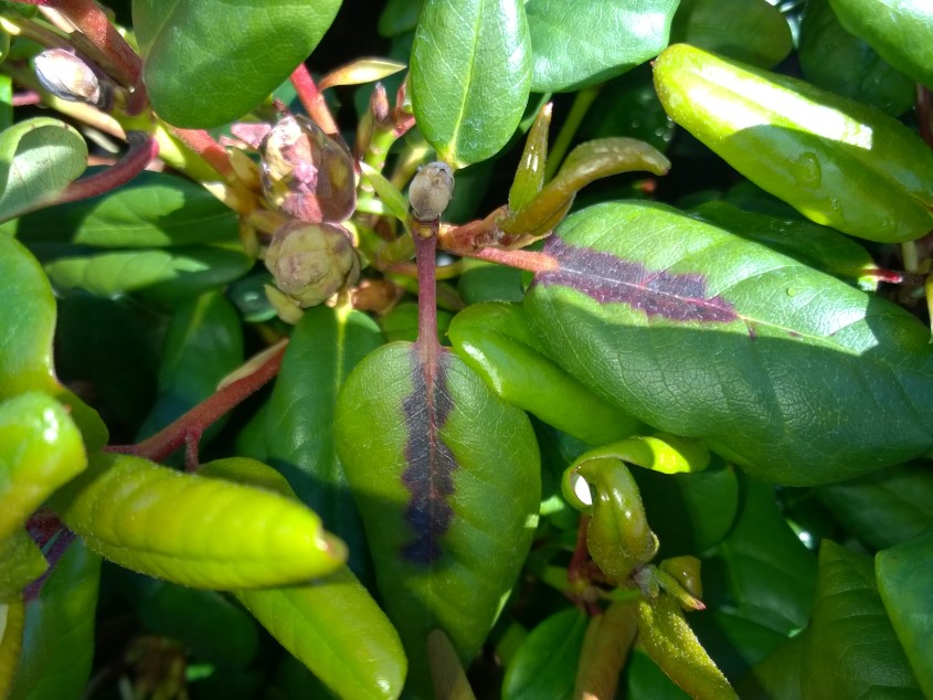 Versopoltteen aiheuttamaa keskisuonen tummumista alppiruusulla. Kuva: Kim Tilli (Ruokavirasto)