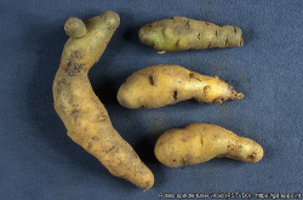 Perunan sukkulamukulaviroidin aiheuttama mukulan epämuotoisuus. Kuva NPPO, Alankomaat.