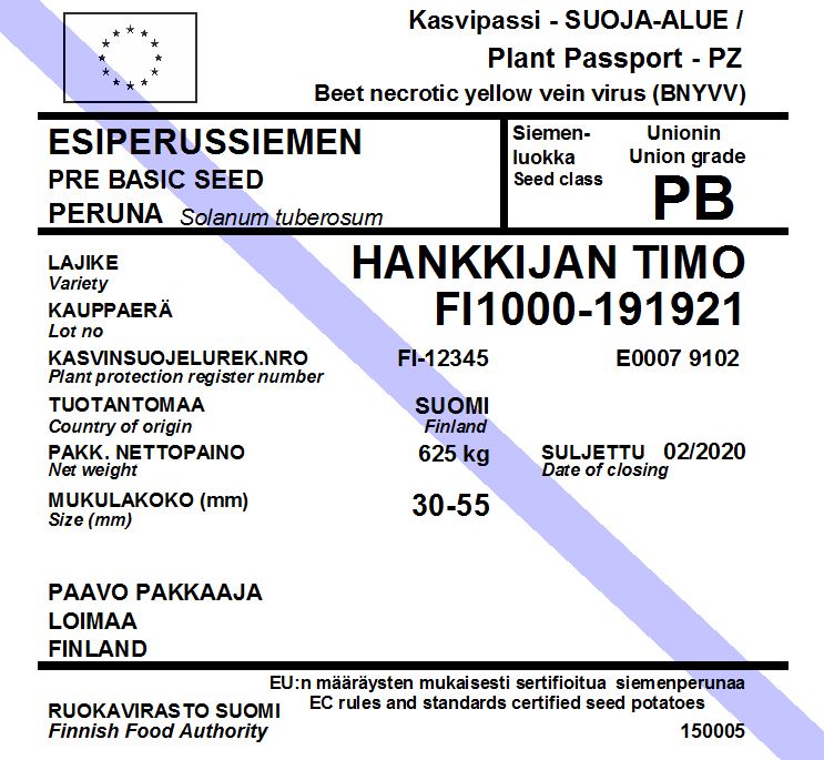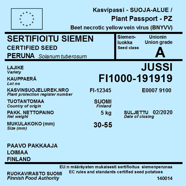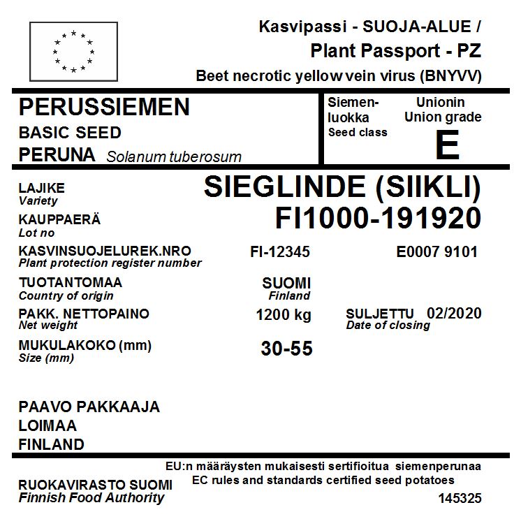 Siemenperunan vakuustodistus toimii samanaikaisesti kasvipassina, johon on merkitty perunatuottajan kasvinterveysrekisteritunnus. Vakuustodistus on virallinen asiakirja. Pakkaaja ei saa tehdä vakuustodistuksiin omia merkintöjä.