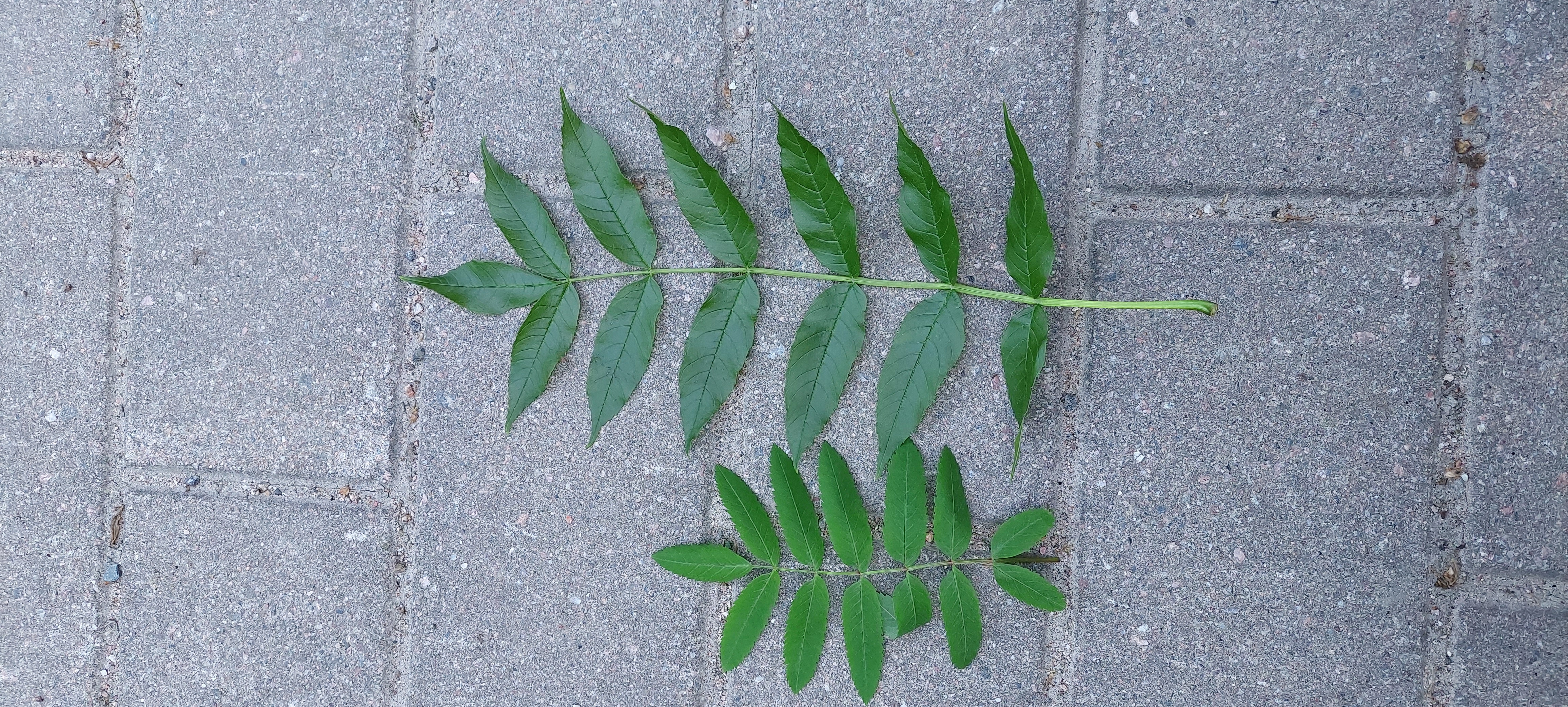 Myös pihlajan lehdet ovat parilehdykkäisiä, mutta pihlajan lehdet ovat paljon saarnen lehtiä pienemmät. Huomioi yllä mainittu saarnen lehden koko! Kuvat: Aino-Maija Alanko.