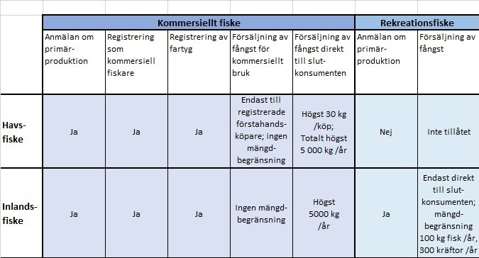 Ifall gränsen på 5 000 kg/år överskrids, ska en registreringsanmälan om livsmedelsverksamhet lämnas. Lagstiftningen om fiskeripolitik ställer egna krav och begränsningar på försäljning av fisk. Se nedan.