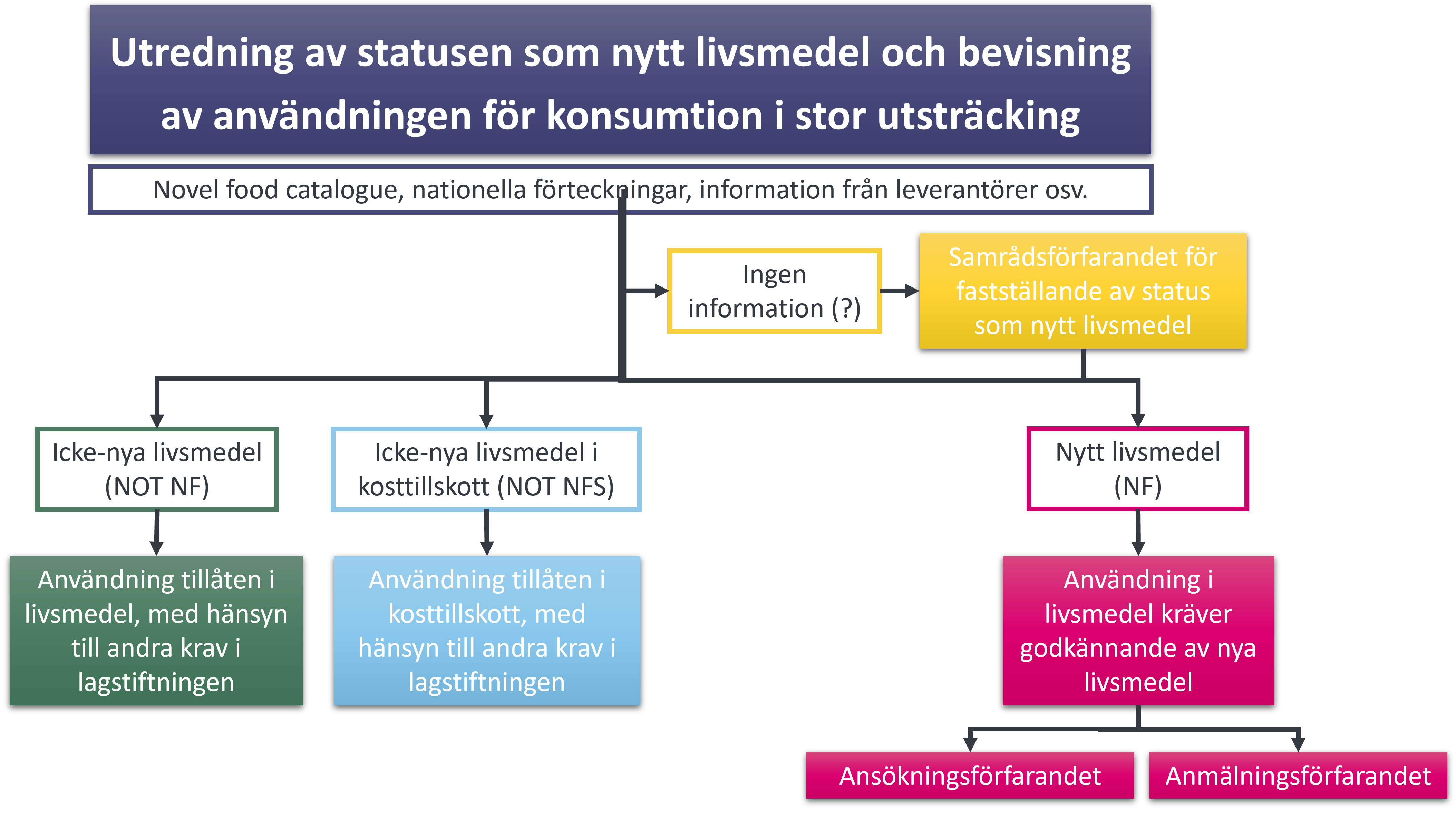 Enligt ansökningsförfarandet bedöms det nya livsmedlets säkerhet. Ansökan om godkännande görs i det elektroniska system som finns på Europeiska kommissionens webbplats för nya livsmedel. Ansökan om godkännande ska bland annat omfatta en undersökning av det nya livsmedlets sammansättning och säkerhet. Säkerheten bedöms av EFSA, Europeiska myndigheten för livsmedelssäkerhet.