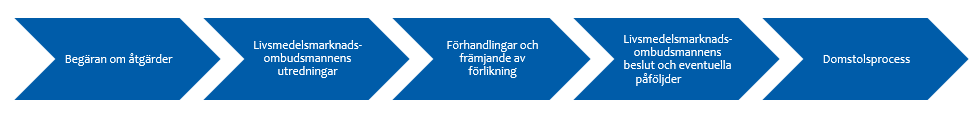 Livsmedelsmarknadsombudsmannen strävar efter att avgöra ärenden som gäller överträdelser av lagen i första hand genom förhandlingar så att näringsidkaren avslutar det lagstridiga förfarandet. Ombudsmannen kan också vid behov bistå parterna i en tvist bland annat genom att utreda ärendet.