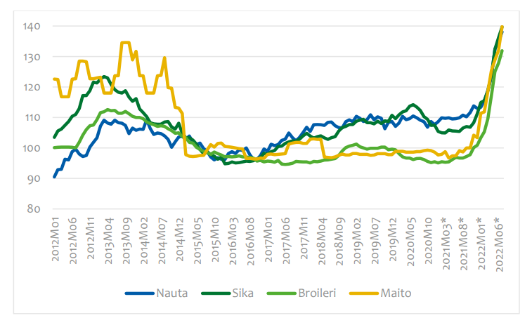 Producentpriserna på kött började stiga i slutet av året i kölvattnet av kostnadsökningen. I juli 2022 hade priserna på griskött och broiler stigit med cirka en tredjedel och priset på nötkött med cirka en fjärdedel jämfört med motsvarande tidpunkt året innan. Producentpriset på mjölk steg under samma period med cirka 41 procent. Producentpriserna på spannmål steg raskt till följd av den knapphet som orsakades av det svaga skördeåret.
