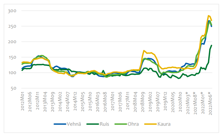 Den kraftiga kostnadsökningen är inte bara ett problem för primärproduktionen. Också industrin har drabbats av exceptionellt stora kostnadsökningar. Enligt beräkningar som Robonomist gjort för Livsmedelsindustriförbundet har insatspriserna inom livsmedelsindustrin i augusti 2022 stigit med cirka 27 procent jämfört med motsvarande period året innan. Det har också förekommit problem till exempel med tillgången på förpackningar. De högre energipriserna utgör dessutom en prövning för såväl primärproduktionen, industrin som handeln. Då konsumtionen i allt högre grad riktar sig mot förädlade produkter och färdigmat ändras industrins kostnads- och intäktsstruktur. Produktionsinsatserna och arbetsmomenten blir fler. Samtidigt skapas det dock mervärde för marknaden, vilket borde ge mer pengar till kedjan.