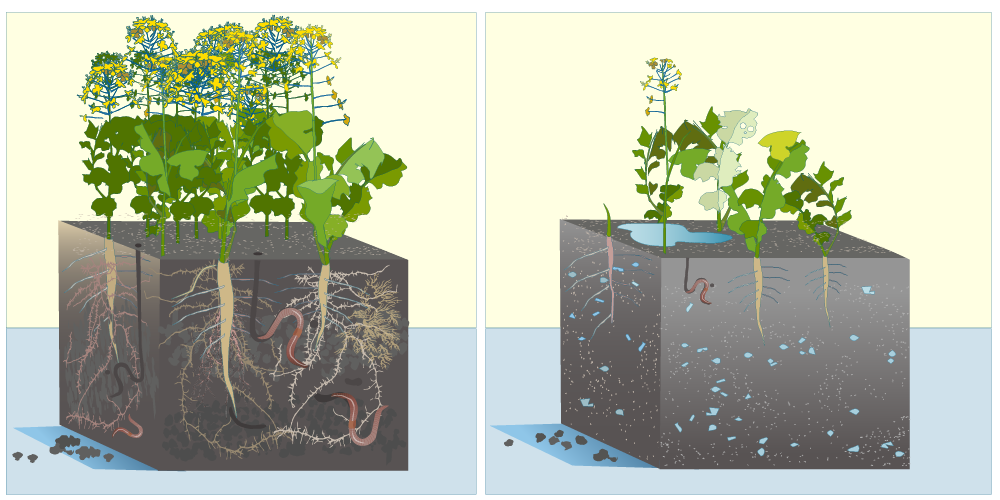 Exempelbild om god (till vänster) och dålig (till höger) markhälsa.