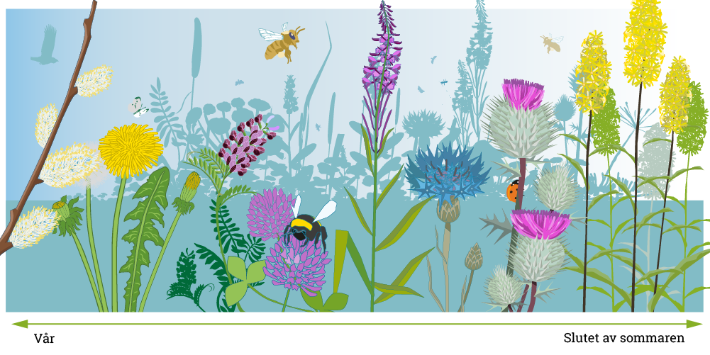 Antalet blommor på en gård varierar vanligen kraftigt under växtperioden. Du kan jämna ut den här variationen genom att skapa en god blomkontinuitet. Med blomkontinuitet avses att växtarter som lämpar sig för pollinerare blommar oavbrutet, så att pollinerarna får näring från växterna under hela sin livscykel.