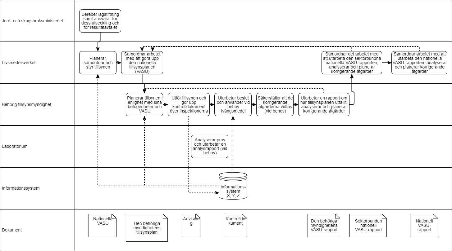 Av bild 2.1.1 framgår de behöriga myndigheterna i livsmedelskedjan, de ministerier som handhar resultatstyrningen samt övriga aktörer som utför myndighetsuppgifter. Detaljer om tillsynsuppgifterna i livsmedelskedjan och rollerna de medverkande myndigheterna har framgår av de sektorbundna beskrivningarna av tillsynssystemen (VASU del 3–5). Flera samarbetsmetoder används i samordningen av tillsynsuppgifter mellan de behöriga myndigheterna (avsnitt 5.1).
