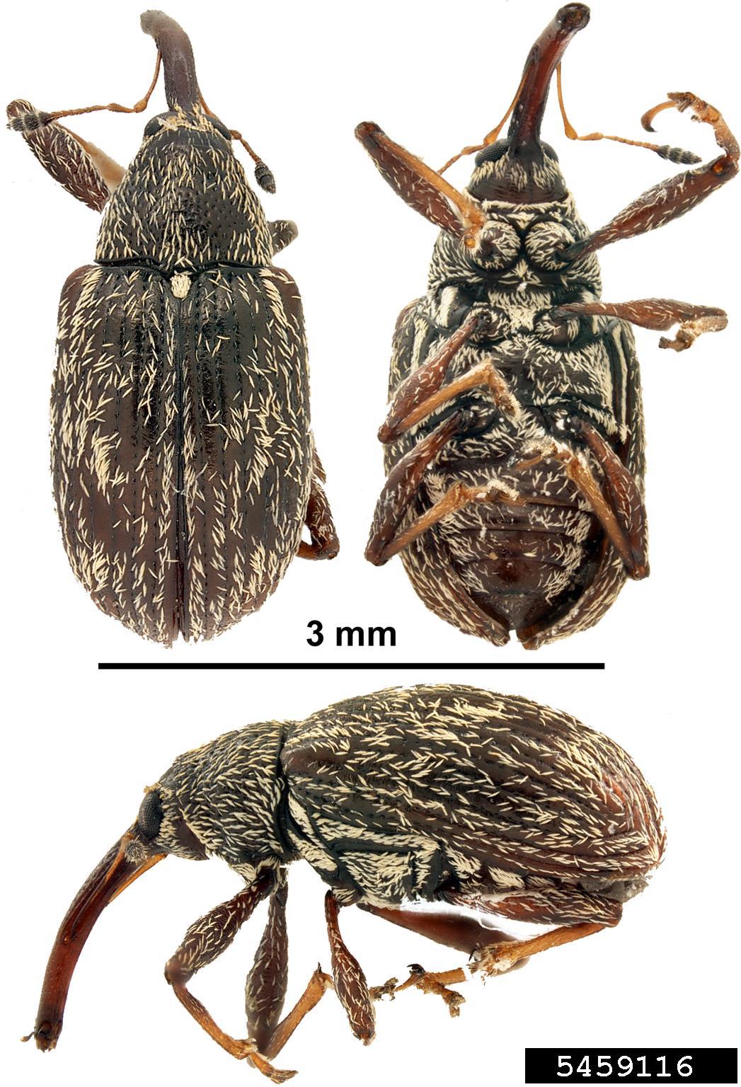 - Fullvuxen: 3 mm lång, färg från mörkbrun till svart. Kroppen täcks av gul behåring som ljusnar då skalbaggen blir äldre. Snabeln är typisk för en vivel.