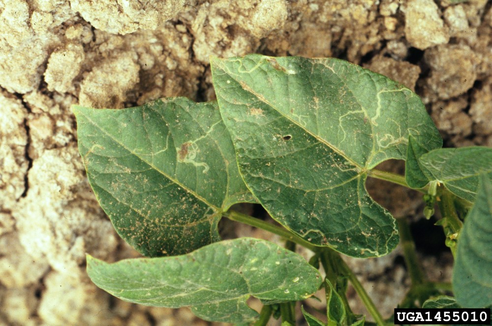 Skador av Liriomyza sativae på bladen av böna (Phaseolus vulgaris). Bild: Whitney Cranshaw, Colorado State University, Bugwood.org