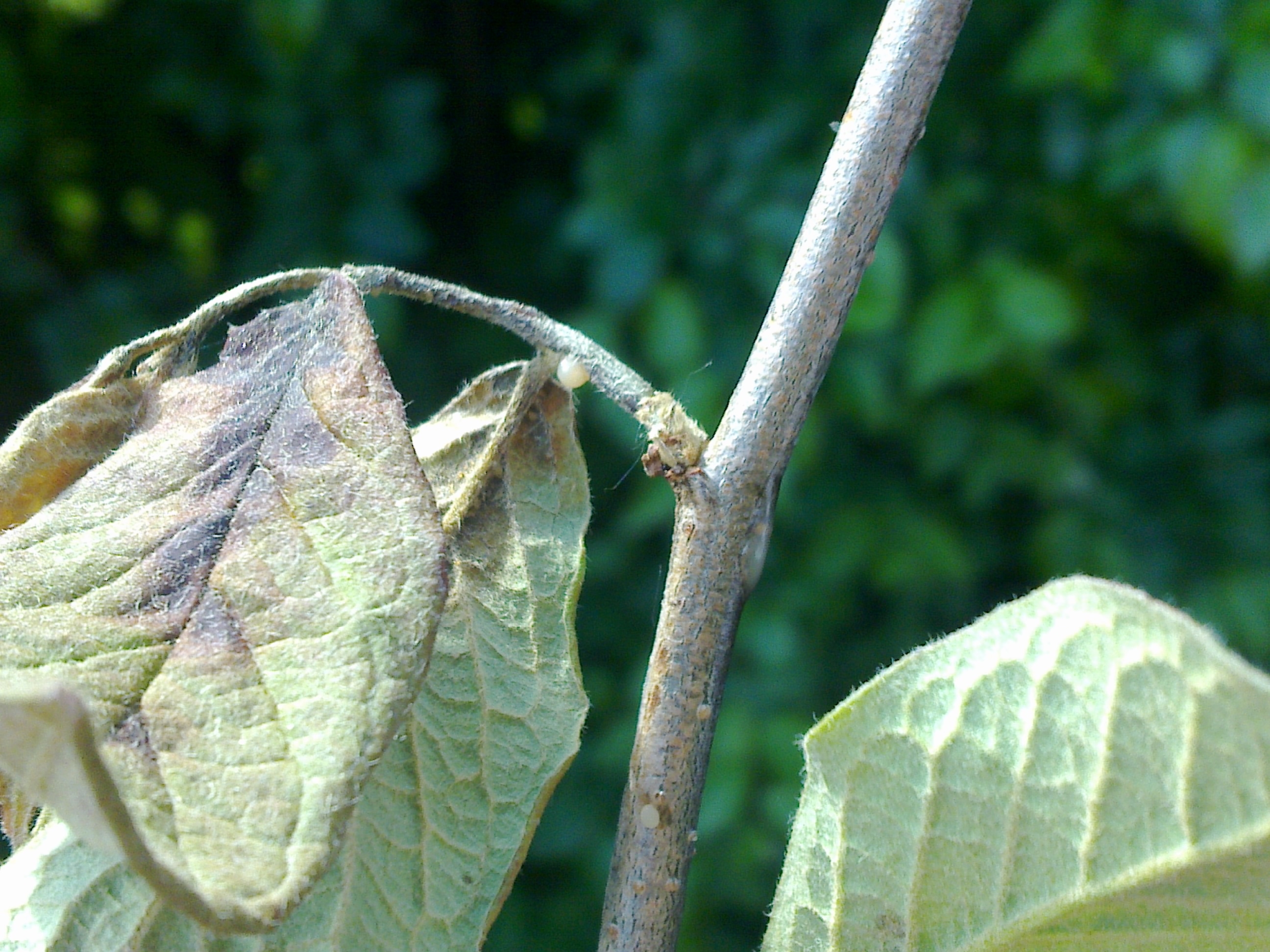 - På bladen bildas nekrotiska områden eller också svartnar bladskaften och mittnerven