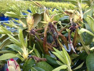 Ett typiskt symptom på rododendron är brunfärgning av mittnerven och bladskaftet samt skotten.