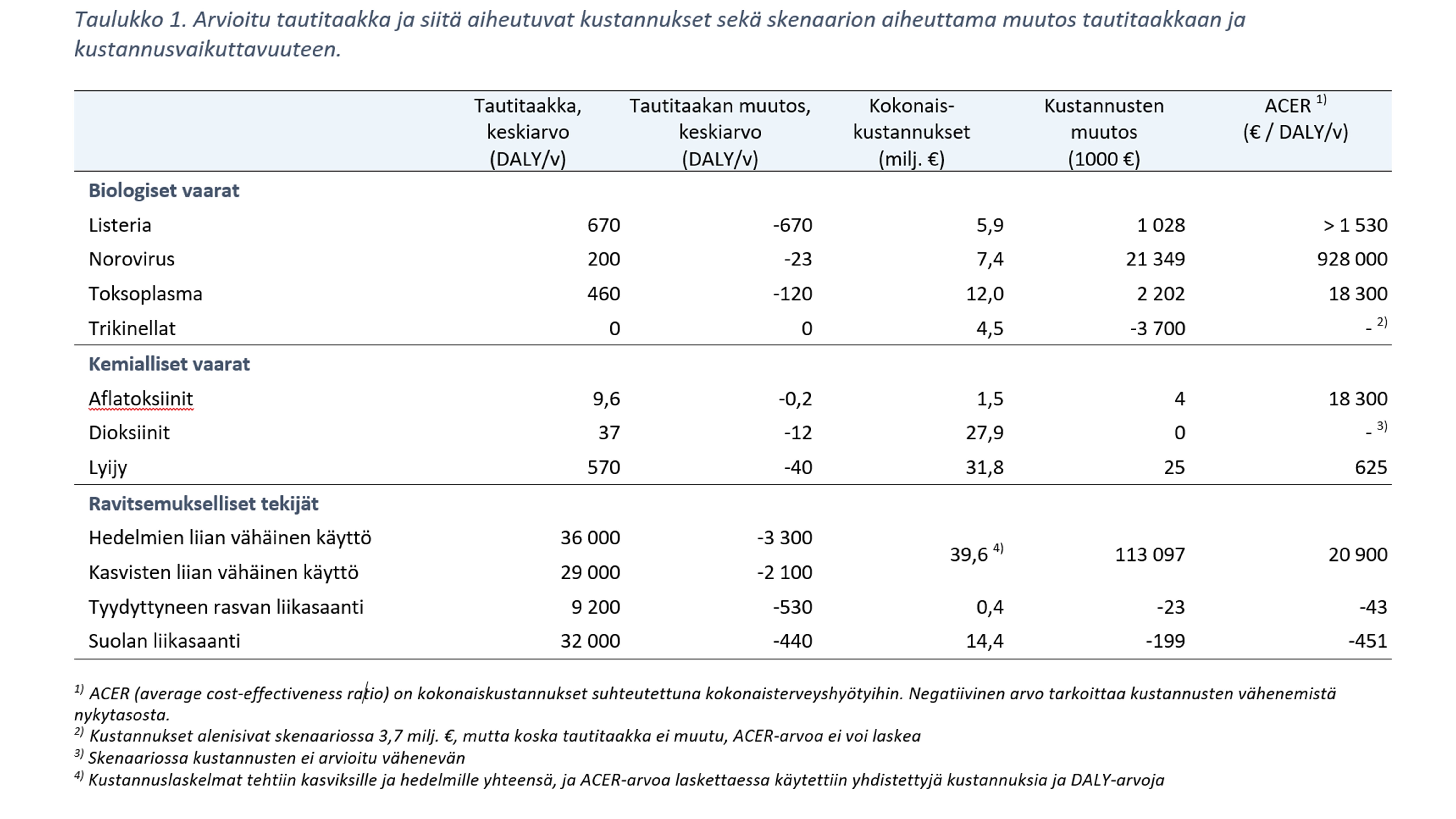 Hankkeen päätulokset esitetään taulukossa 1. Tulosten perusteella on mahdollista asettaa tekijät terveydellisten ja/tai taloudellisten vaikutusten perusteella tärkeysjärjestykseen. Ravitsemukselliset tekijät aiheuttavat suurimman tautitaakan, mutta skenaarion mukainen arvonlisäveron poistaminen kasviksilta ja hedelmiltä niiden käytön lisäämiseksi aiheuttaisi yli sadan miljoonan euron kustannukset. Suolan ja rasvan saannin vähentäminen korvaamalla kaikki lounasravintoloissa tarjotut tuetut ateriat Sydänmerkki-kriteerit täyttävillä aterioilla olisi kustannusvaikuttavin tapa tautitaakan pienentämiseksi. Trikinellan valvonnan rajaaminen sianlihan vientiin vaikuttaisi käytetyillä oletuksilla suomalaisten tautitaakkaan mitättömän vähän, mutta valvontakustannukset vähenisivät noin 3,7 miljoonaa €.
