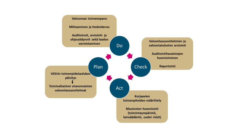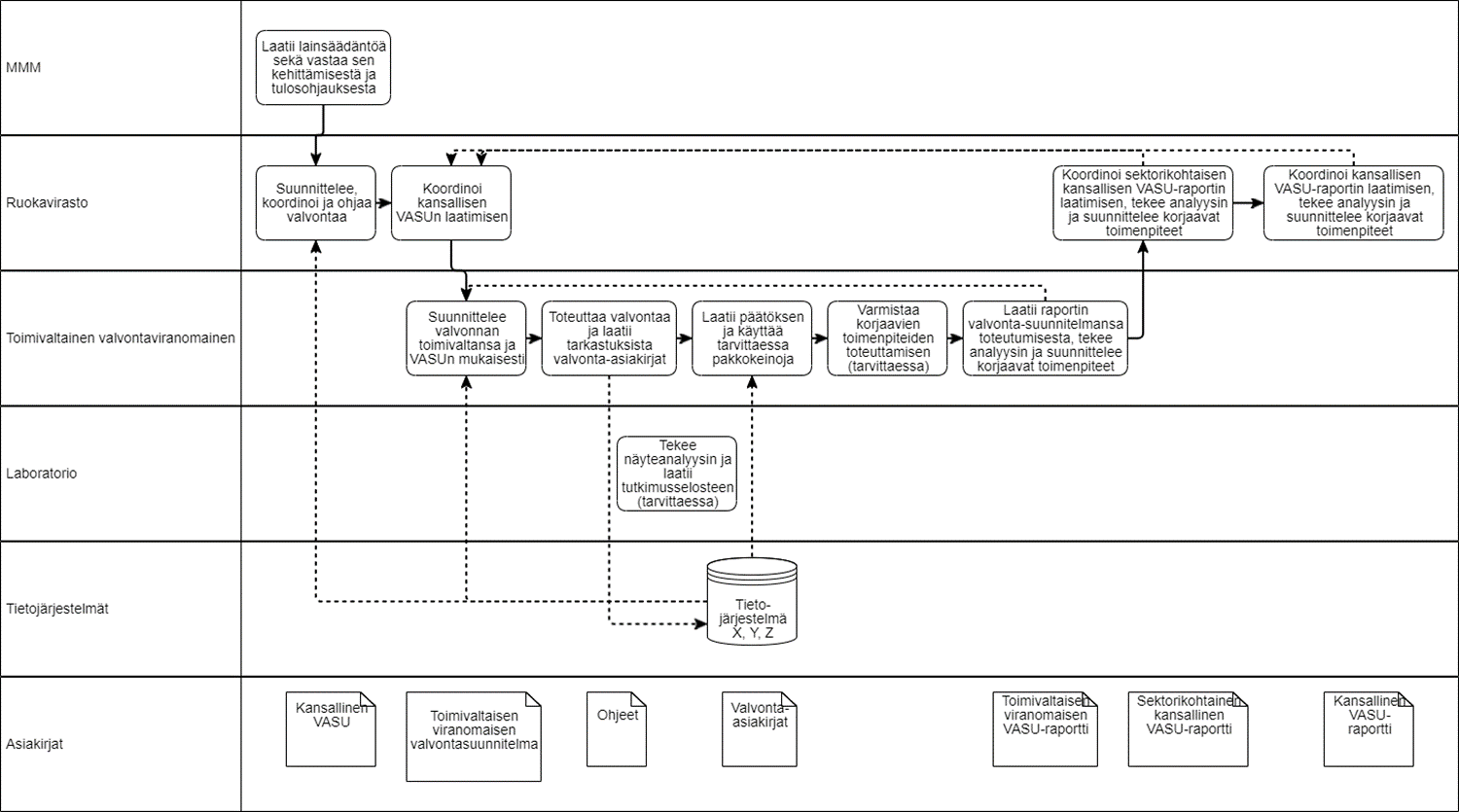 Suomen monivuotinen kansallinen valvontasuunnitelma, VASU, on kaikkien elintarvikeketjun viranomaisten yhteinen ”tiekartta”, jonka avulla varmistetaan valtakunnallisesti viranomaisvalvonnan poikkileikkaavat ja yhdenmukaiset tavoitteet ja painopisteet sekä laatu ja kehittäminen. Suomessa VASUun on sisällytetty kaikki elintarvikeketjun valvontajärjestelmät riippumatta siitä, kuuluvatko ne virallista valvontaa koskevan asetuksen soveltamisalueeseen. Viranomaistoiminnan edellytetään huomioivan yhteiskunnalliset muutokset ja mahdolliset uudet riskit. Näiden hallinnassa VASU on yksi tärkeimmistä työkaluista, sillä se perustuu toiminnan jatkuvan kehittämisen periaatteeseen. Kukin toimivaltainen viranomainen käyttää VASUa oman toimintansa suunnitteluun, toteuttamiseen ja seurantaan.