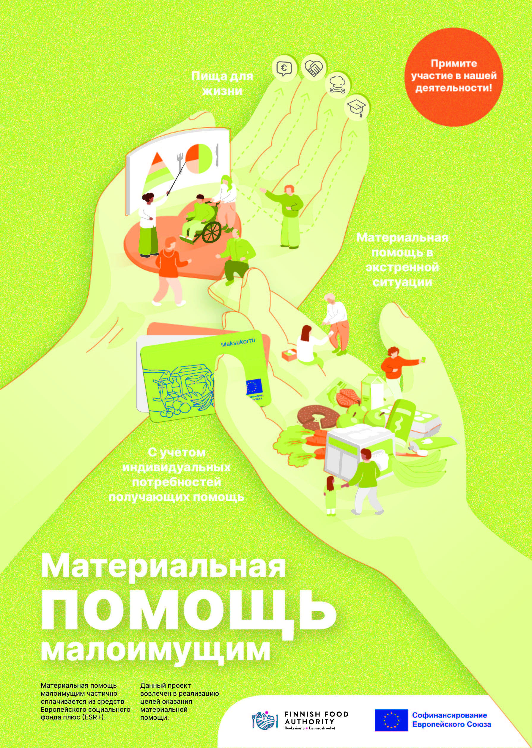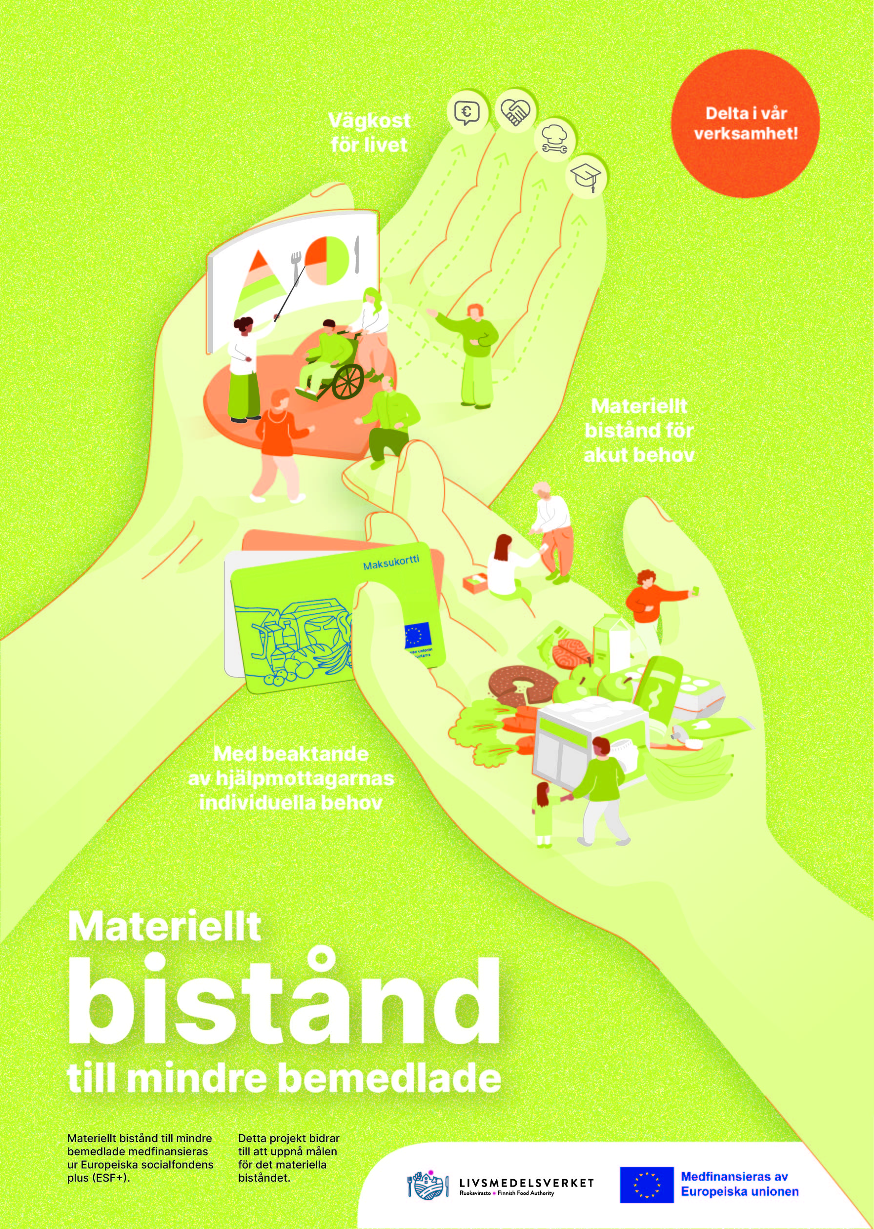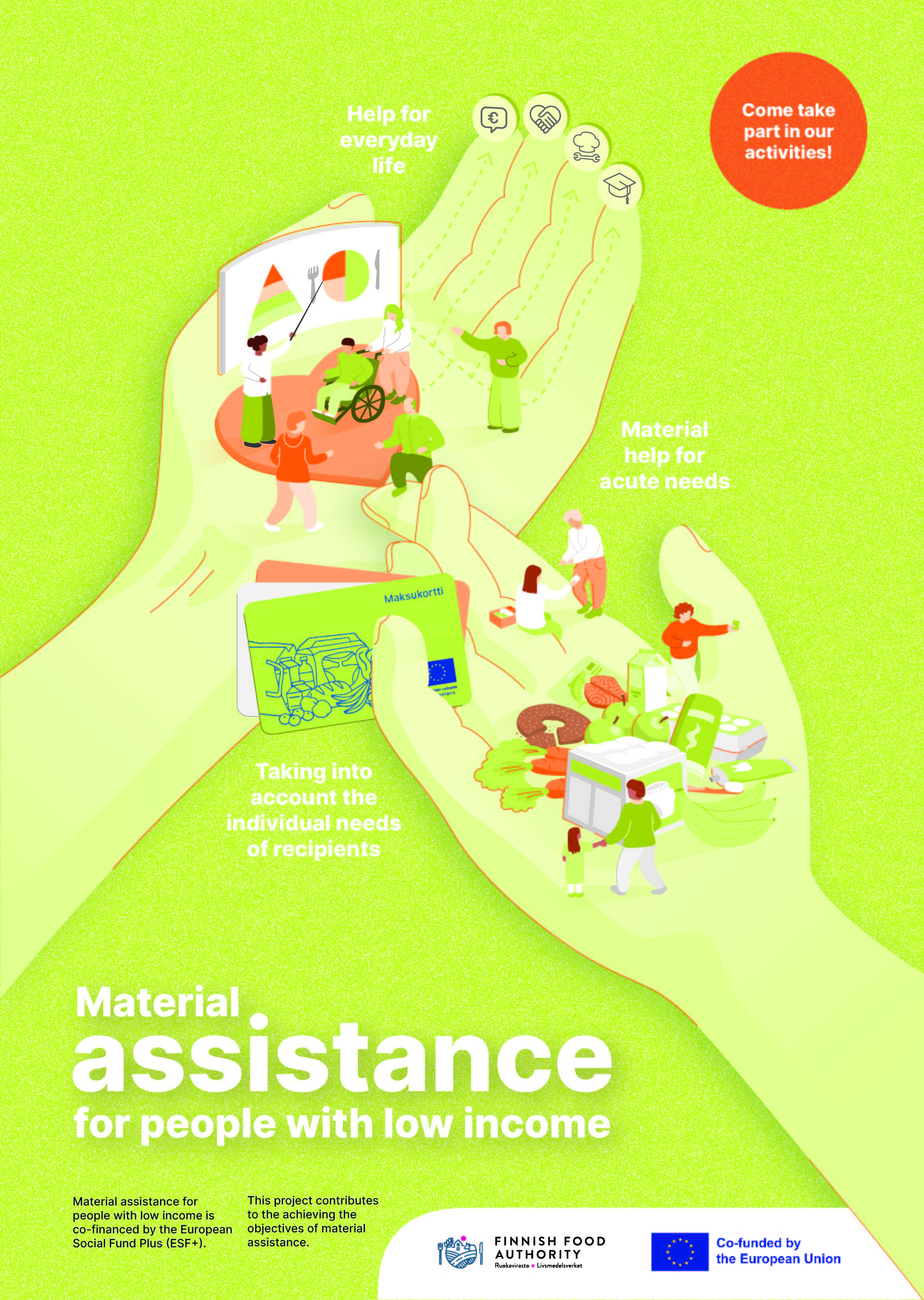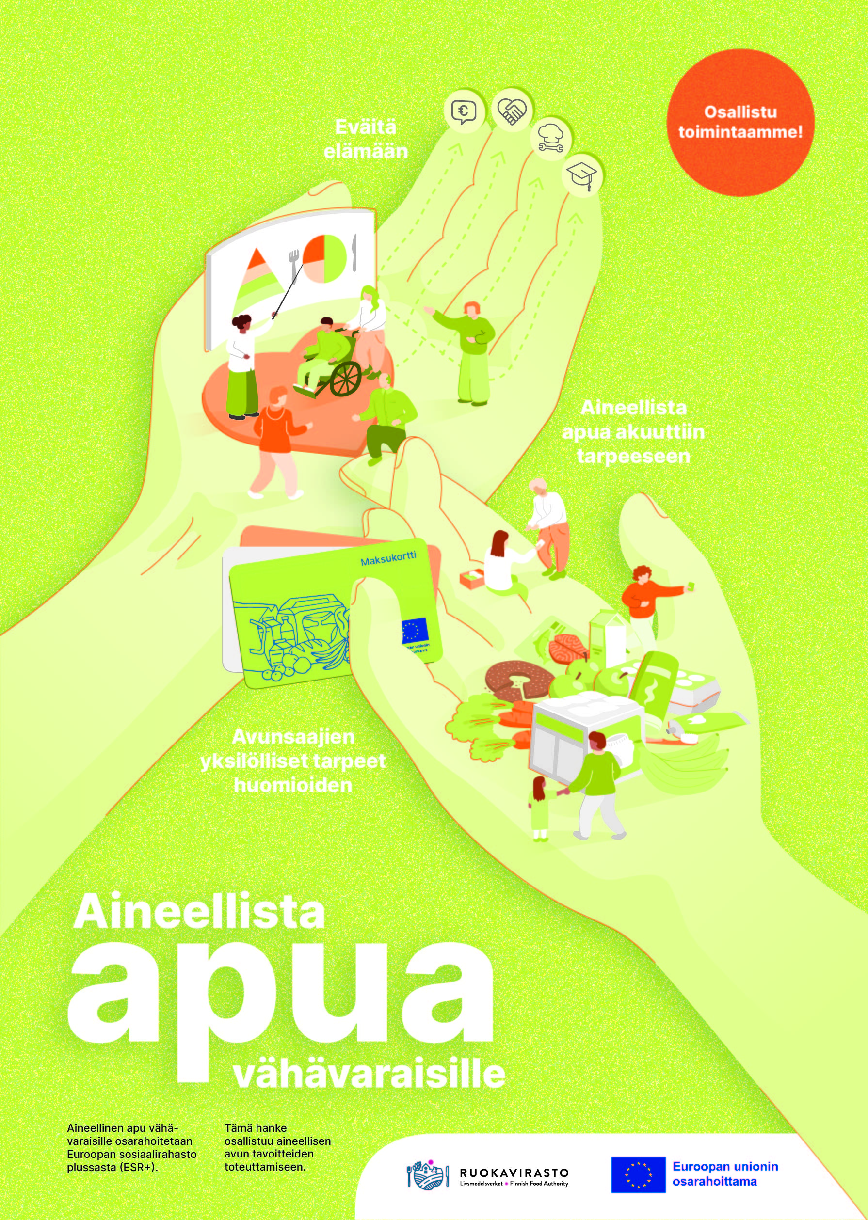 Hanketoteuttajalla on oltava riittävät taloudelliset ja muut edellytykset hankkeen toteuttamiseksi sekä tarvittava osaaminen hankesuunnitelmassa asetettujen tavoitteiden saavuttamiseksi. Hyväksytyt hanketoteuttajat hankkivat maksukortit ja koordinoivat liitännäistoimet, jotka voivat liittyä terveellisen ruokavalion ohjaukseen, velkaneuvontaan, sosiaalihuoltoon, työllisyys- ja koulutuspalveluihin ja järjestöjen erilaisiin toimintoihin. Avunsaaja käyttää EU-osarahoitteista maksukorttia elintarvikkeiden ja perustuotteiden maksamiseen päivittäistavarakaupassa. Ostoskorista poissuljetaan veikkaus-, alkoholi- ja tupakkatuotteet.