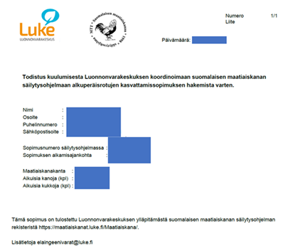 - Kanoista todistus kuulumisesta Luonnonvarakeskuksen maatiaiskanojen säilytysohjelmaan.