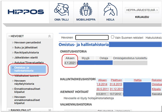 Hevosen on oltava hakijan hallinnassa sopimusvuonna 1.1.-31.12. ELY-keskuksen sopimuskäsittelijä tarkastaa, että hevonen on hakijan hallinnassa Suomen Hippos ry:n Heppa-järjestelmästä, http://heppa.hippos.fi/heppa/app hevosen perustiedoista kohdasta Omistus- ja hallintahistoria. Jos hevosesta on omistushistorian lisäksi tieto myös kohdassa hallintahistoria, tarkastetaan hallinta hallintahistoriasta.