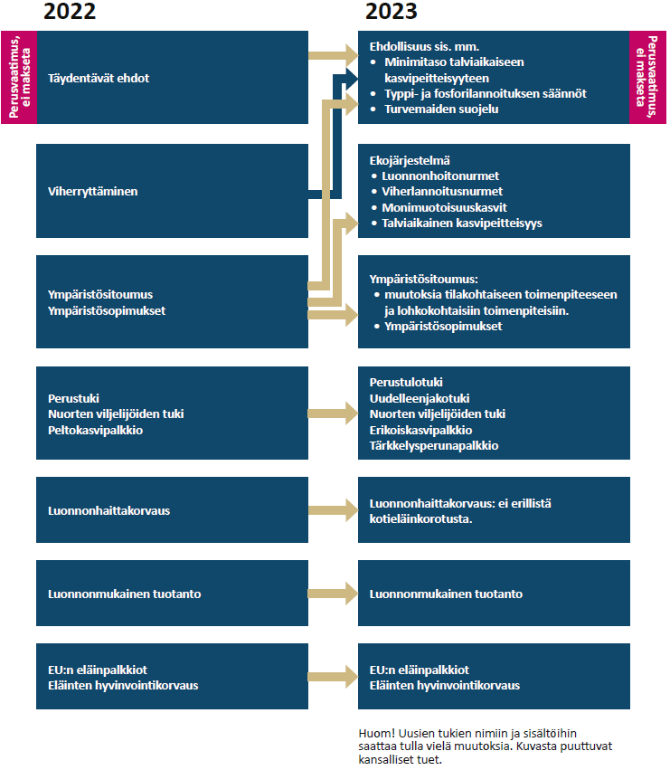 Uusi CAP-kausi muuttaa haettavia tukia ja niiden ehtoja. Maa- ja metsätalousministeriön laatima CAP-suunnitelma määrittää vuosille 2023–2027 suunnitellut maatalouden tukitoimet reunaehtoineen. Tässä esitettävät tiedot perustuvat 22.12.2021 Euroopan komissiolle toimitettuun Suomen CAP-suunnitelmaan. Koska komissio ei ole vielä hyväksynyt Suomen suunnitelmaa, suunnitelmaan voi tulla vielä muutoksia. Päivitämme ja täydennämme tietoa vuoden 2023 tukihausta osoitteeseen ruokavirasto.fi/cap.