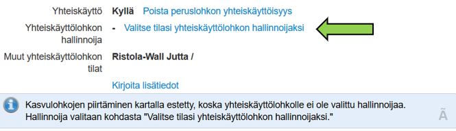 Kun kaikki yhteiskäyttölohkon osalliset ovat merkinneet lohkon yhteiskäyttöön, on hallinnoijan seuraavaksi piirrettävä ja kohdistettava kaikkien osallisten kasvulohkot. Ensimmäinen askel on merkitä itsensä hallinnoijaksi. Yhteiskäyttölohkolla on vain yksi hallinnoija, eikä hallinnoijaa suositella vaihdettavan kesken tallennusta. Toiminto tapahtuu peruslohkotiedoista riviltä Yhteiskäyttölohkon hallinnoija klikkaamalla linkkiä Valitse tilasi yhteiskäyttölohkon hallinnoijaksi.