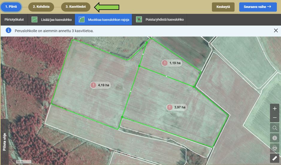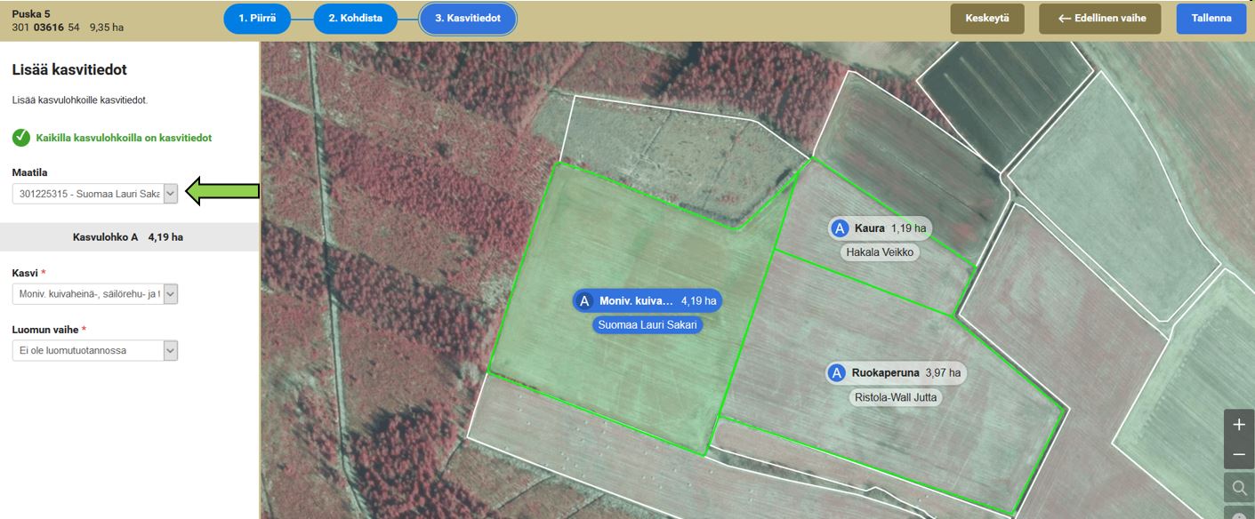 Hallinnoija voi antaa kaikille kasvulohkoille kasvitiedot vaiheessa 3. tai muokata olemassa olevia. Siirtyminen eri kasvulohkojen välillä tapahtuu joko klikkaamalla haluttua kasvulohkoa kartalla tai vasemmasta sivupalkista Maatila-alasvetovalikosta.