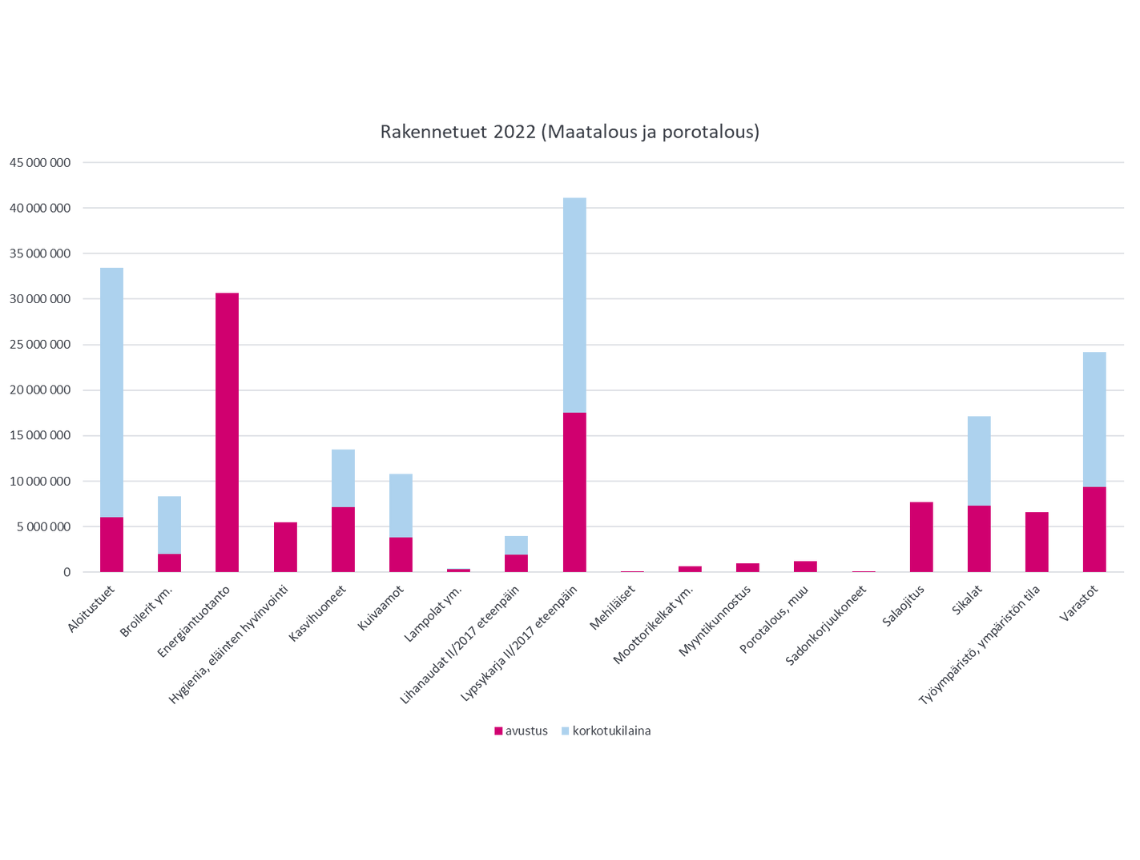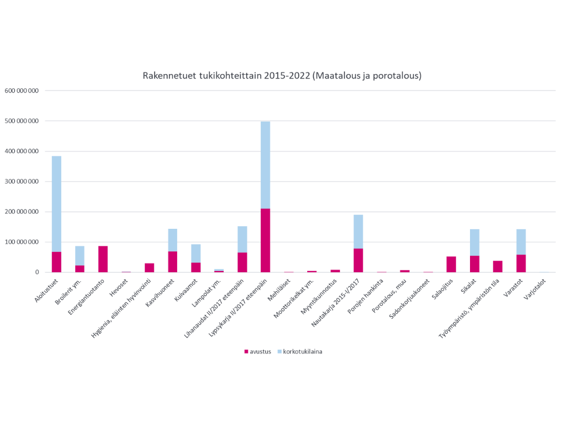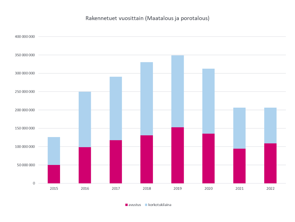 Vuosina 2015–2022 ELY-keskukset myönsivät avustusta maatalouden investointeihin ja tilanpidon aloittamiseen lähes 900 miljoonaa euroa. Korkotukilainoja myönnettiin 1,2 miljardia euroa ja valtiontakauksia lähes 80 miljoonaa euroa. Yli 2200 aloittavalle viljelijälle myönnettiin aloitustukea tilanpidon käynnistämiseen.